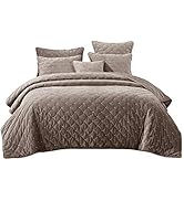 The Tache Velvet Dreams King Bedspread Set features a plush crushed velveteen top with elegant diamond tufted pin-tuck stitching, filled with a 300gsm medium weight quilt for optimal warmth. Measuring 108x100 inches, this set includes a quilt and two shams in a neutral tan beige, designed for year-round comfort and easy machine care, making it a durable and stylish addition to any contemporary bedroom.