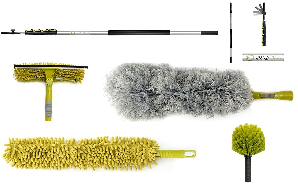 The DocaPole Cleaning Kit features a robust 24-foot telescoping stainless steel pole paired with versatile attachments including a multi-blade window squeegee, microfiber feather duster, flex-and-stay ceiling fan duster, and an electrostatic cobweb duster. Designed for high-reach cleaning with scratch-free microfiber technology and customizable tools, itβs perfect for professionals and meticulous homeowners aiming to maintain spotless, hard-to-access spaces.