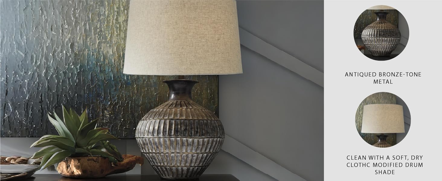 The Signature Design by Ashley Magan Table Lamp features a textured antique bronze metal base paired with a beige fabric drum shade. Measuring 18"W x 18"D x 28.5"H, it offers a 3-way rocker switch for adjustable lighting up to 150 watts. Designed for indoor use, this UL-listed lamp combines durable craftsmanship with stylish versatility, perfect for office desks or nightstands seeking a warm, sophisticated glow.