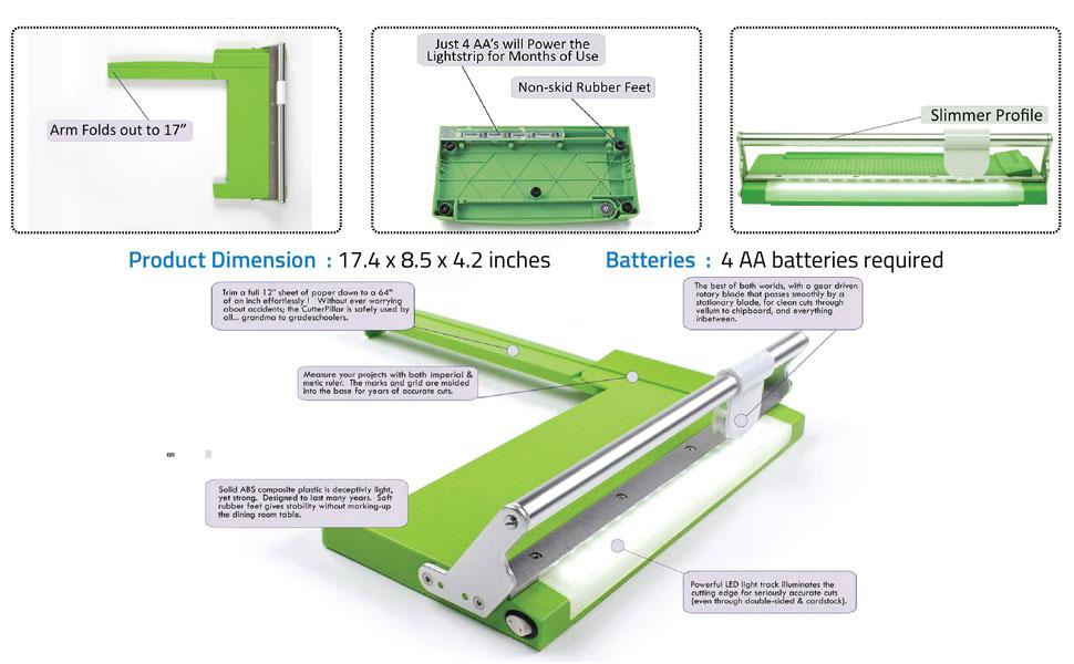 I have been using this cutter for a few weeks now and really really like it. I purchased it since I got tired of buying replacement blades, so I needed a more permanent solution. I read the reviews and decided to go with the CROP for its size. I love how it cuts, the light is helpful.Negative:-The numbers and measurements are hard to see. This is a known issue with this cutter, I can't believe the manufacturers refuses to correct it.-I take it camping, and the battery compartment in the back is always loose, I will be placing a piece of tape to keep it in place. This battery cover feels cheap.-The arm doesn't fold close - this would be a great engineering improvement as it would allow for ease of transport to crops and conventions. This can be easily achieved the engineers would need to add a lock for when we want to cut in order to ensure a straight cut.-A little pricey, when the 12x12 is only about $15 more.-The arm which makes it into a 12x12 doesn't have a lock. It opens during transport, and it makes it awkward to figure out where to hold it to lift it/carry it.-Carrying it is a challenge since you can't lift/carry it by the cutting arm, the 12x12 section that opens is flimsy and unlocked, and if you hold it on the other side by the light...based on where your fingers hit you may open the battery compartment below - it has happened to me twice. See flimsy battery compartment comment above.+++++++POSITIVE++++++++AMAZING CUTS, Which is why I bought it in the first place!!! Always straight as long as you hold your paper down.+NO need for REFILL blades!!! Another reason I bought it!!+The light is helpful, although I don't always use it. I get migraines but it hasn't triggered any. Light is bright.+Smaller size, but still has the same capabilities as the 12x12. - I am mostly a cardmaker, so I don't need a 12x12 platform in my cutter at all times. A smaller platform means less space on my table as well.+The platform doesn't end in a weird measurement. I had a Fiskars cutter which folded in half, but the half mark was at 5.5inches (I know right!!!!), Not this one, great design in this respect.