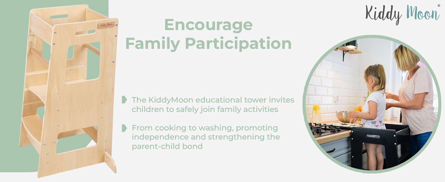 The KiddyMoon Kitchen Helper is a sturdy, adjustable Montessori learning tower designed for children aged 18 months to 7 years. Featuring a secure safety railing, non-toxic finishes, and a 3-step height adjustment, it empowers kids to safely engage in kitchen activities alongside parents, fostering motor skills and independence.