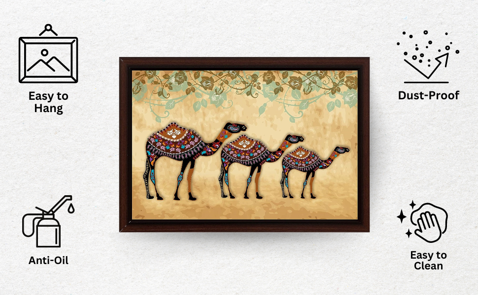 The Masstone Camel Painting is a beautifully framed wall art piece measuring 20x14 inches, crafted from UV textured wood for durability and dust resistance. Ideal for enhancing the aesthetic of various spaces, this painting not only serves as a stunning decor item but also promotes positive energy, making it a thoughtful gift for friends and family.
