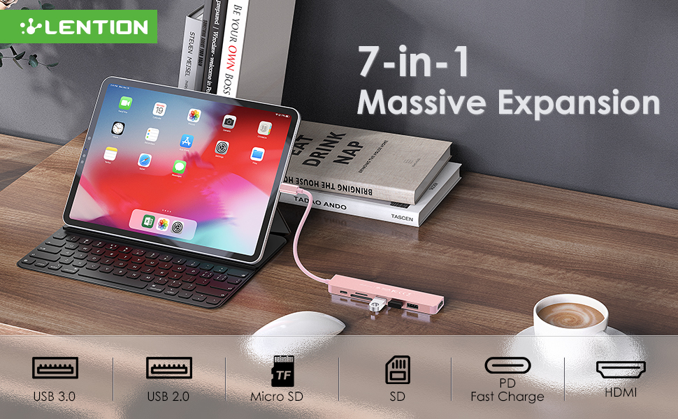 The LENTION USB C Hub CE18 is a versatile 7-in-1 adapter designed for professionals on the go, featuring 100W Power Delivery charging, 4K HDMI output, multiple USB ports, and SD/Micro SD card readers. Compatible with a wide range of USB-C devices including MacBook Pro/Air, Surface, and Chromebook, it ensures stable, interference-free performance with advanced driver technology.