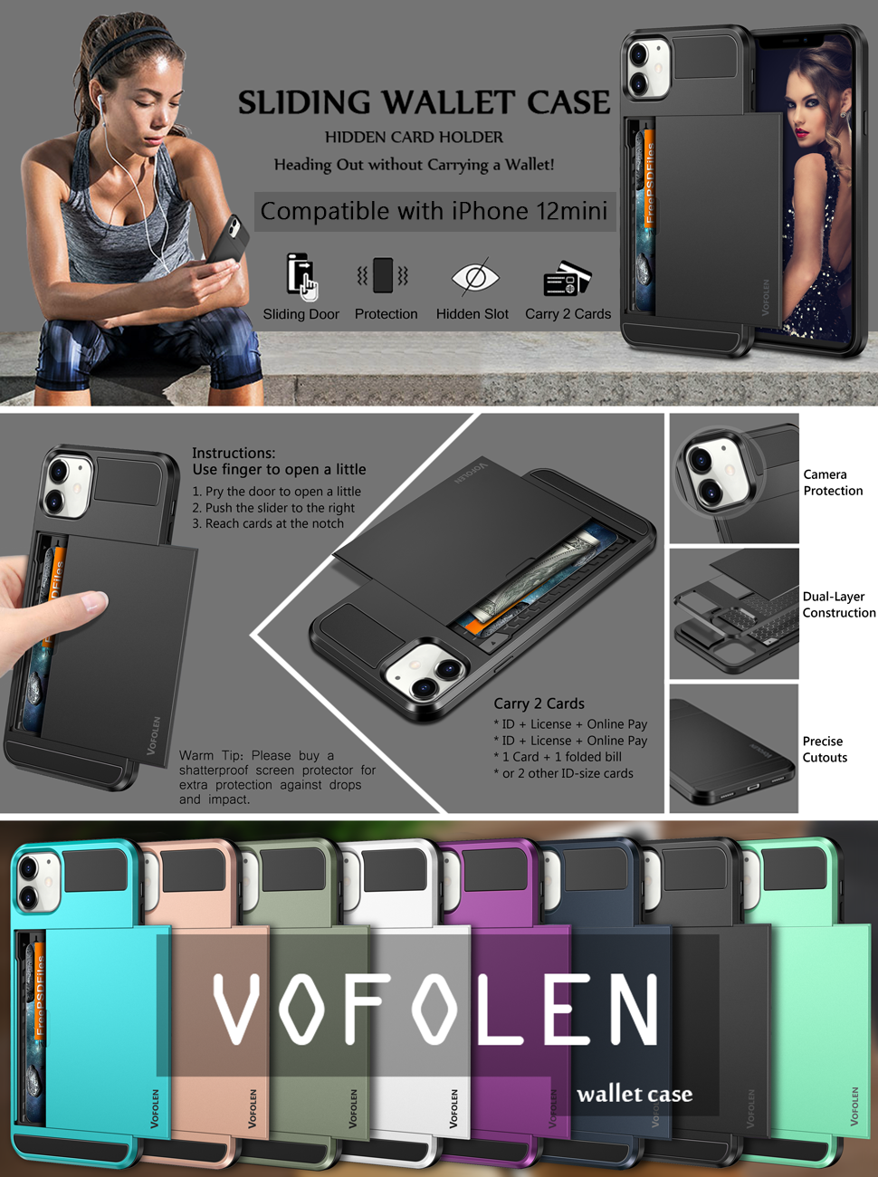 Vofolen Compatible with iPhone 12 Mini Case 5G Wallet Cover Credit Card Holder Slot Sliding Door Hidden Back Pocket Anti-Scratch Dual Layer Protective Shell Compatible with iPhone 12 Mini Black