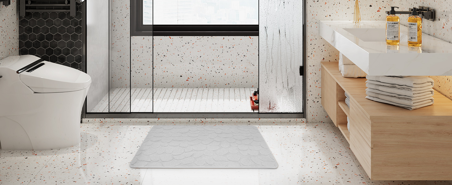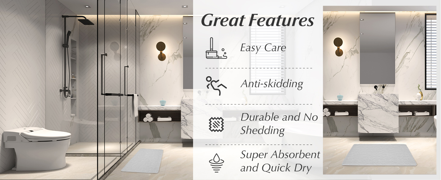 The COCOER Non Slip Bath-Mat is a 17"x28" gray mat designed for safety and comfort. With super absorbent properties, a non-slip rubber backing, and a low-profile design, it fits perfectly under doors and is machine washable for easy care. Ideal for bathrooms, kitchens, and laundry rooms, this mat combines functionality with modern style.