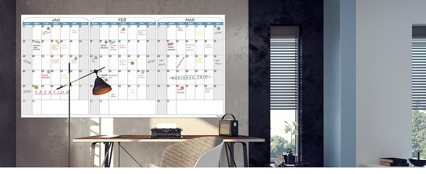The CLEVER CLEAN Large Dry Erase Wall Calendar is a 36"x72" undated, 3-month horizontal planner designed for home, school, and office use. Featuring premium nano erase film for easy cleaning, it includes 8 colorful markers, reusable icons, and mounting accessories. Its jumbo size and customizable start month empower professionals to visualize and manage their schedules with clarity and style.