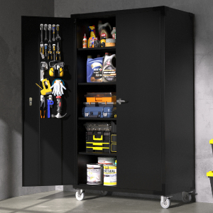 The VINGLI Upgraded Garage Storage Cabinet is a spacious, industrial-style metal cabinet measuring 43''W x 20''D x 72''H, featuring 34% more width than typical models. It boasts a heavy-duty steel frame supporting up to 750 lbs total load, lockable double doors with built-in pegboards and hooks, four adjustable shelves, and smooth-rolling, lockable rubber wheels for easy mobility. Ideal for garages, workshops, or offices, it combines security, durability, and versatile storage in one sleek black unit.