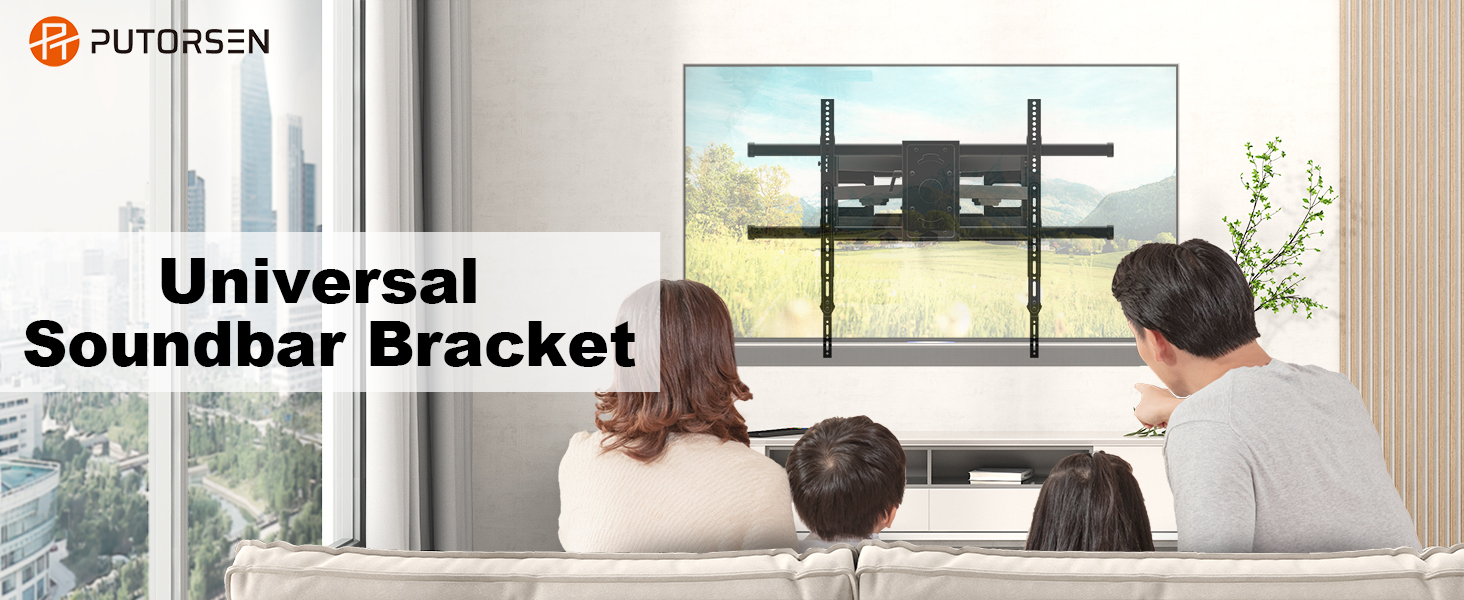 The PUTORSEN Soundbar Bracket is a versatile, metal mounting solution designed for TVs between 23 and 65 inches and soundbars up to 15kg. It offers adjustable width (385-480mm) and angle (±45°) for perfect alignment, supports VESA patterns from 75x75 to 600x400, and ensures a clean, space-saving setup with easy installation and professional customer support.