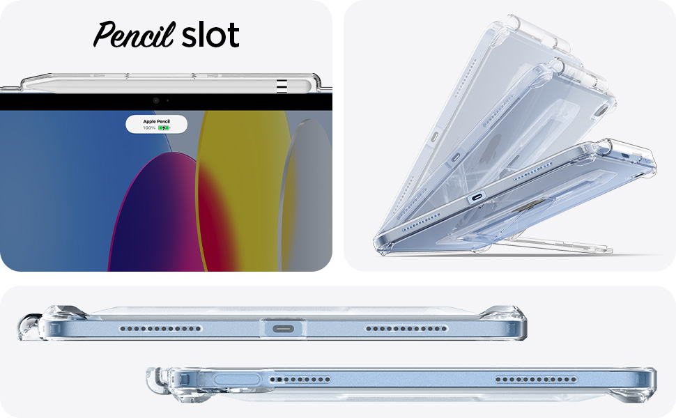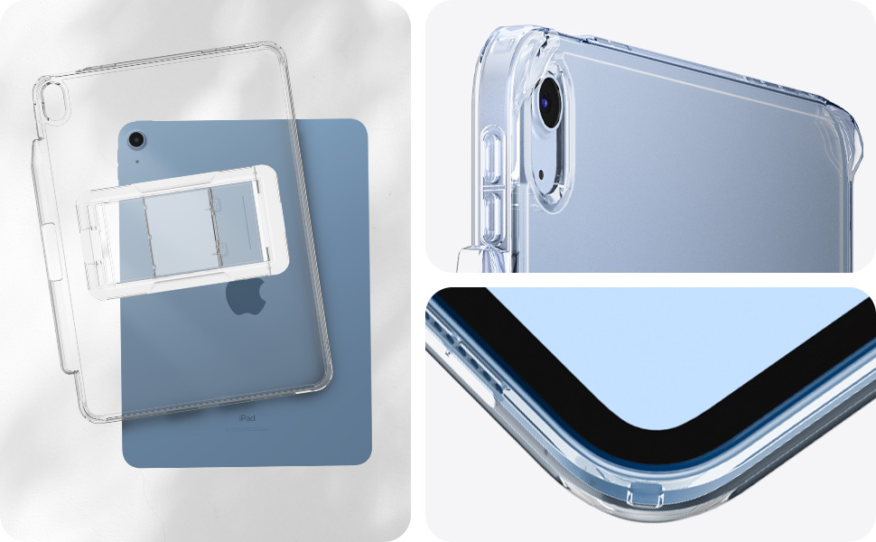 The Spigen Air Skin Hybrid S case for iPad 11th Gen A16 and 10th Gen A14 Bionic features a durable PC back and TPU bumper with Air Cushion Technology for superior drop protection. It offers three kickstand angles for flexible viewing and a built-in Apple Pencil 2 holder compatible with wireless charging. Lightweight, crystal clear, scratch-resistant, and waterproof, this case blends sleek design with practical functionality.