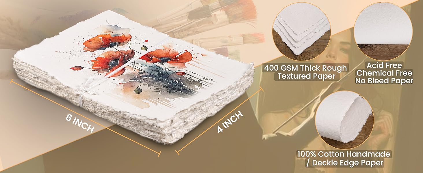 This pack of 25 handmade, 6"x4" sheets features 400 GSM thick, rough-textured watercolor paper crafted from 100% virgin Egyptian cotton. Acid-free and eco-friendly, the deckle-edged sheets offer a premium, durable surface perfect for watercolor, sketching, and mixed media, making it a must-have for artists seeking quality and sustainability.
