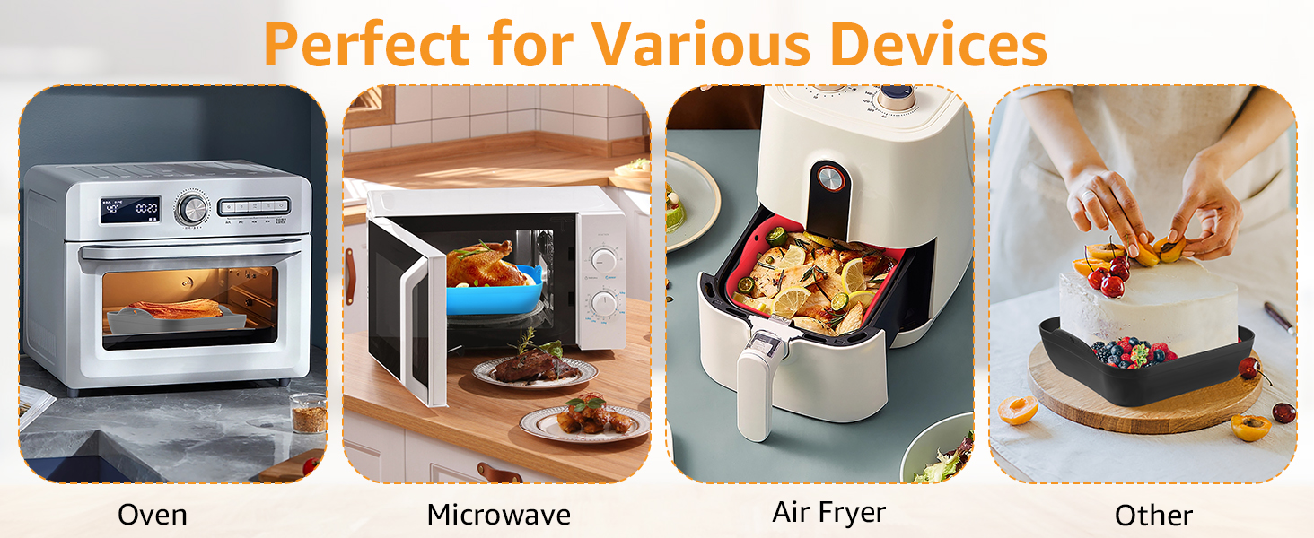 I ordered these to use in my air fryer for baking, and for cooking things like bacon or steak that are messier to clean up. I have ended up using them for just about everything I cook in the air fryer, as well as my toaster oven and my microwave. They are a good size since I am cooking for just my husband and myself, and the versatility is great! I can microwave a frozen veggie while I cook a frozen steak in the air fryer, and bake a small dessert while we eat dinner, and still have one more left to put leftovers in the refrigerator.Clean up is super easy also. I just rinse food debris, use one squirt of dawn power wash, and wipe out with a sponge. They flip inside out making it much easier to clean out, and then afterward I just set them in the dishwasher to air dry. Because food doesn't stick, it takes about 30 seconds to clean them.My toaster oven and air fryer both heat up to 400° F and I have had 0 issue using these at these temps, and fully expect these will last a long while, with multiple daily use. For the roughly 6$ for this set of 4, I have no complaints, and would purchase again if they eventually need replacing or grow legs and walk away. I will buy more like this, but would like a different size for other purposes. I am happy I bought these, and they have made my life SO. MUCH. EASIER!