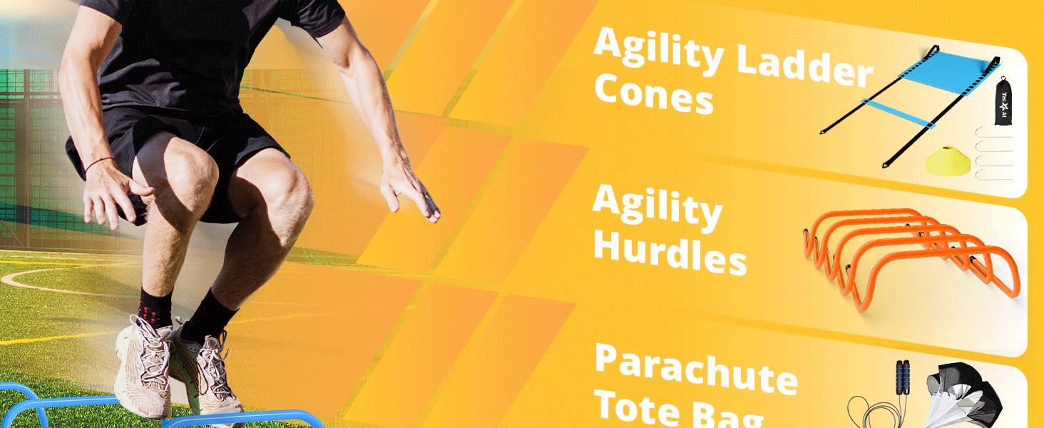 The Yes4All Agility Ladder Speed Training Equipment Set is a comprehensive training solution featuring an adjustable agility ladder, 12 soccer cones, 5 hurdles, a jump rope, and a running parachute. Designed for durability and versatility, this set caters to all ages and skill levels, making it ideal for athletes and fitness enthusiasts looking to enhance their speed and agility.