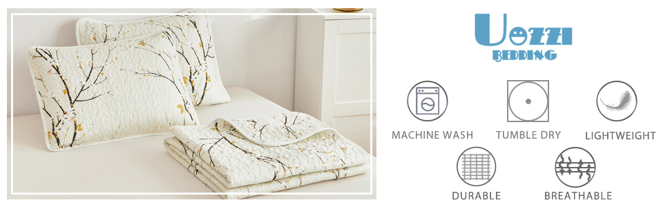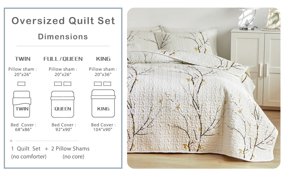 The UOZZI BEDDING King Size Quilt Set features a stylish cream white reversible design with black branches and yellow flowers. Measuring 102"x88", it includes a quilt and two pillow shams made from soft, breathable 100% microfiber polyester. Lightweight and perfect for all seasons, this easy-care set elevates your bedroom aesthetic while ensuring comfort and durability.