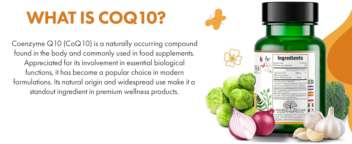 Source of Nature® Coenzyme Q10 delivers a high-strength, 200mg dose of naturally fermented, bioidentical ubiquinone in vegan capsules. With 120 capsules per bottle, it offers a convenient 4-month supply of a 99% pure, non-GMO, gluten-free formula enhanced with BioPerine® for superior absorption. Manufactured in Denmark under strict European quality standards and third-party tested for purity, this supplement supports antioxidant health and daily energy for health-conscious professionals.