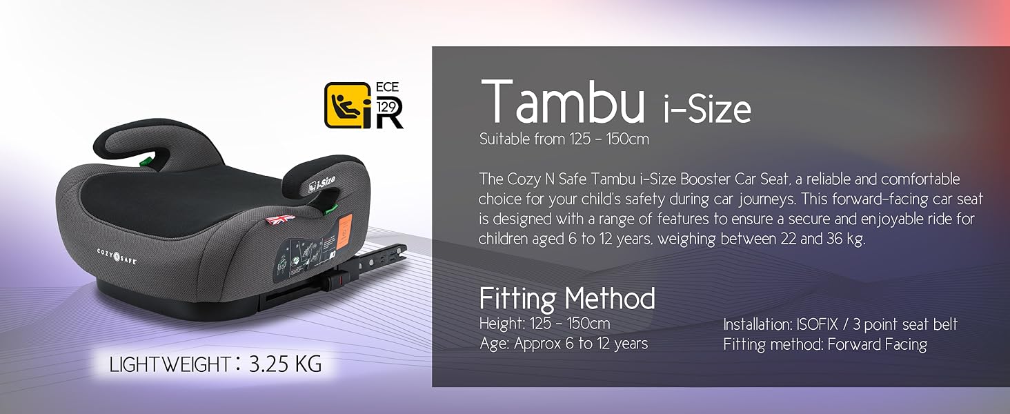 The Cozy N Safe Tambu i-Size ISOFIX is a lightweight, compact backless booster car seat designed for children aged 6 to 12 years, accommodating weights from 22 to 36 kg. It meets stringent ECE R129 regulations, ensuring top-notch safety while providing comfort with its forward-facing design and armrests.