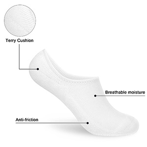 KOOOGEAR White Black No Show Socks, Non-Slip Invisible Trainer Sports Walking Socks Womens 4-7, Ladies Women Anti Blister Cushioned Breathable Cotton Socks with Silicone Stripes 3 Pairs. Size:4-8 UK Size Weight: about 25g/pair Features: 1.Main Fabric 81% Cotton, 16% Polyamide Fibre, 3% Spandex , which designed for outdoor sports socks. Our sports socks are more comfortable, breathable and resistant to blisters, and can keep your feet dry and odorless all day long. 2.The heel is Y-shaped design, the hose and underfoot area with wicking cotton thick cushion. It protects the foot from shear and prevents painfu blisters. Providing perfect foot comfort during trainning, running or any other outdoor sports. 3.Non-slip silicones will be firmly attached to the heel and will not slip even if pulled with gravity!. 4.The elastic band has good elasticity, so socks can be suitable for different foot types. Whether you are big foot or small foot. Warm Tips: 1.The water temperature during cleaning does not exceed 40°C. 2.Washing: Machine Wash/ Hand Wash (suggest using wash bag). Don't iron and bleach. Please Note: 1. Due to the light and screen setting difference, the item's color may be slightly different from the pictures. 2. 0.5-1 cm tolerance of dimension and length difference among due to manual measurement.
