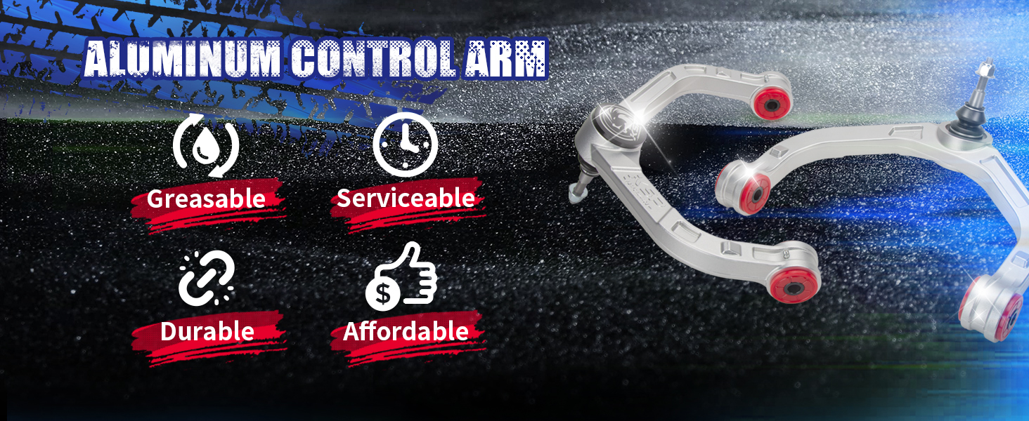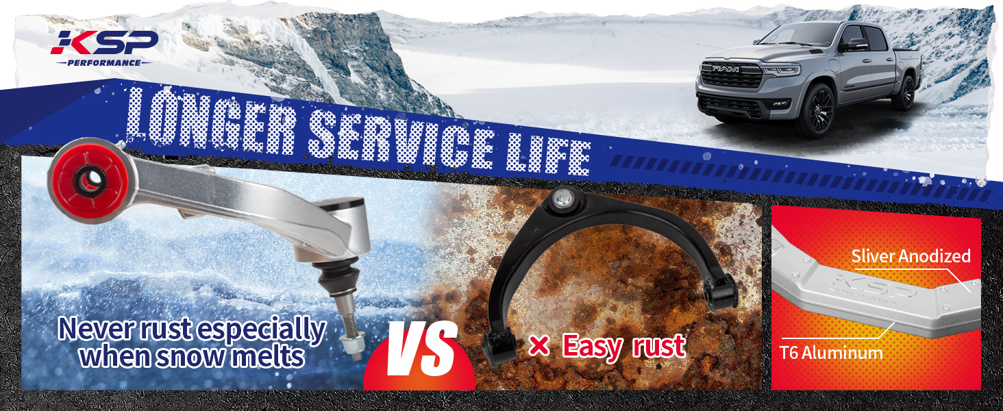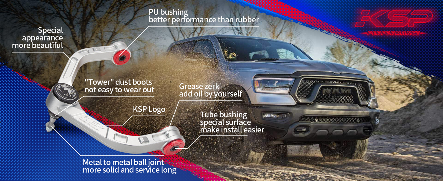 KSP PERFORMANCE’s forged aluminum upper control arms for Dodge Ram 1500 (2009-2022) offer a lightweight yet ultra-strong one-piece design with adjustable fit for 2-4" lifts. Featuring greasable, zinc-nickel coated ball joints and premium polyurethane bushings, these arms resist rust and wear, ensuring long-lasting durability and improved handling on and off the road.