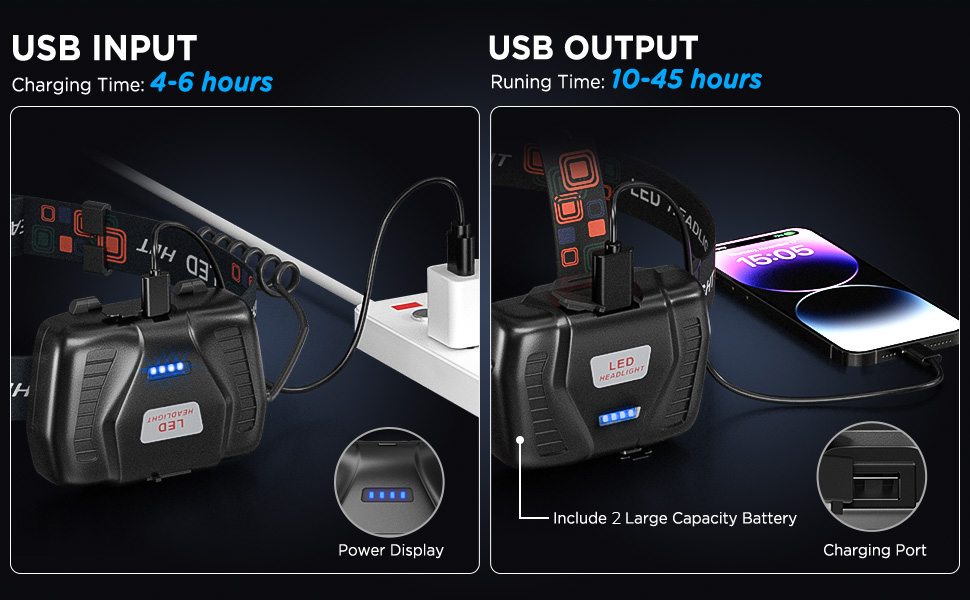 | Special Feature | Βattery, 5 Light Modes, 90°Angle Adjustable, Adjustable Focus, Waterproof, Adjustable Headband, Super Fast Charging 4 hours, Running 45 hours, High-Quality, Power Display, Easy to Carry, Upgraded Design, |