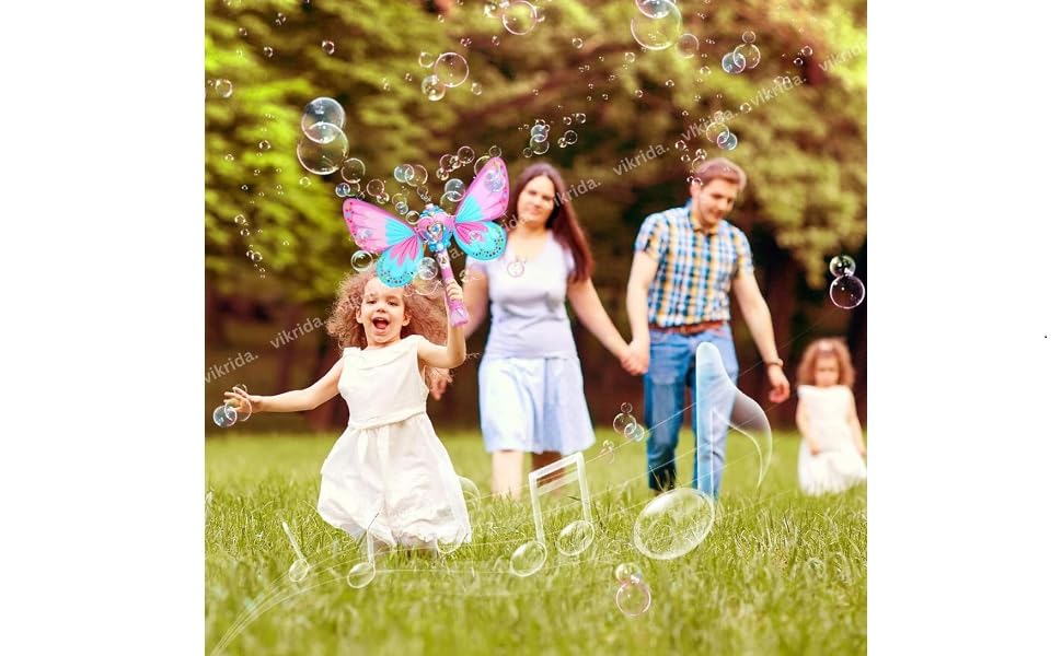 The VikriDa Magic Wand Bubble Machine is a battery-powered, butterfly-winged bubble blower designed for kids aged 3 to 20. Lightweight and durable, it includes two bottles of bubble solution and creates continuous bubbles at the push of a button, making it perfect for indoor and outdoor celebrations like birthdays, weddings, and garden parties.