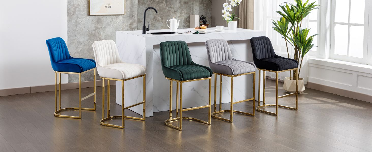 The Wahson Breakfast Bar Stools Set of 4 combines plush velvet upholstery with a sturdy gold metal frame, designed for both style and durability. Featuring high-density foam seats, built-in footrests, and floor-protecting glides, these gray counter stools are perfect for modern kitchens, home bars, or dining spaces seeking a touch of luxe comfort and contemporary elegance.