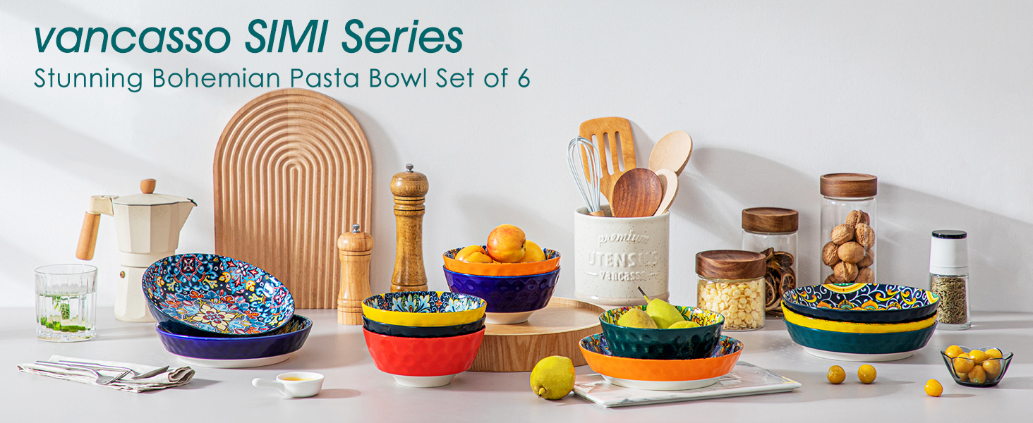The vancassoSIMI Pasta Bowls set includes six 32 oz (946 ml) ceramic bowls crafted from eco-friendly stoneware. Each bowl features a 21 cm diameter and a unique handmade design with deep blue, gold, and red accents. These versatile bowls are microwave and dishwasher safe, resistant to scratches, cuts, acids, and stains, making them perfect for everyday use or special occasions. Their stackable design saves space while adding a touch of elegance to your kitchen or dining experience.