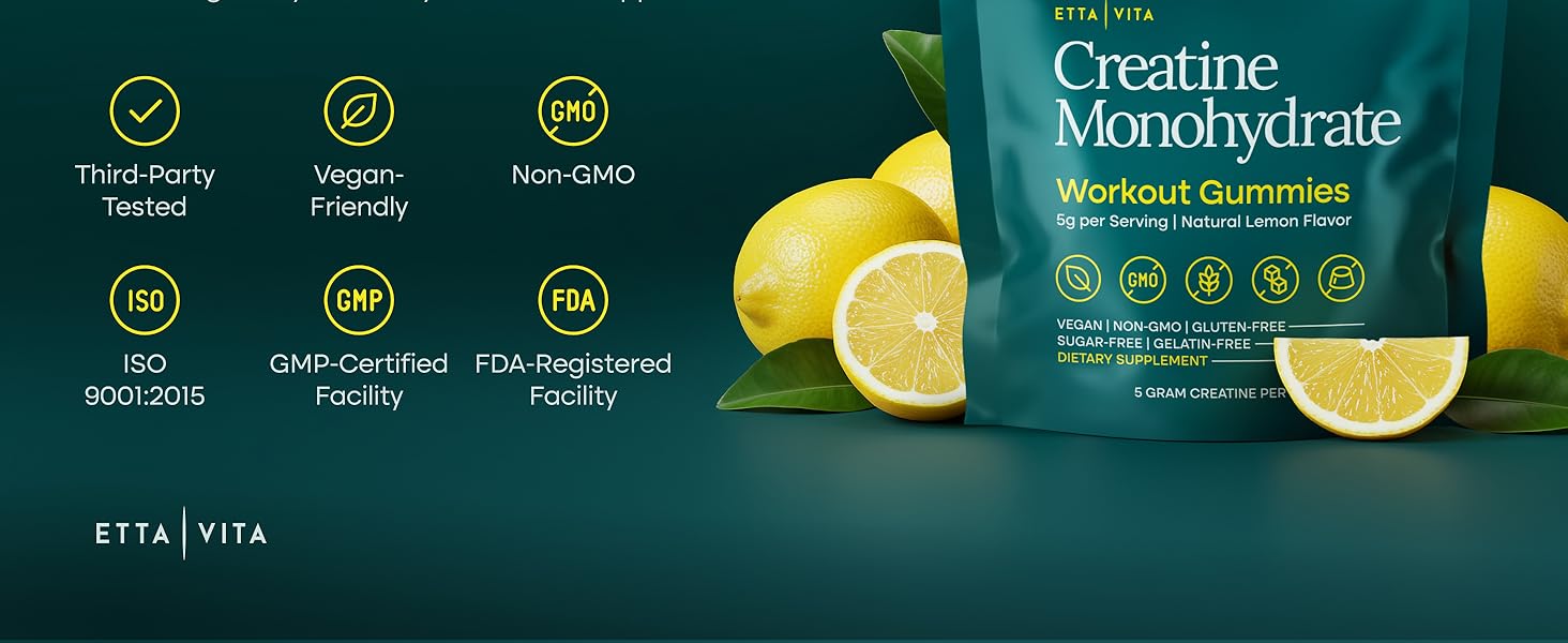 Sugar-Free Creatine Monohydrate Gummies deliver a potent 5g dose of pure creatine per serving in a delicious natural lemon flavor. Manufactured in GMP-certified, FDA-registered US facilities and third-party tested for purity, these vegan, gluten-free gummies support muscle strength, endurance, cognitive focus, and recovery without added sugars or powders. Perfect for busy professionals seeking clean, convenient, and effective supplementation.