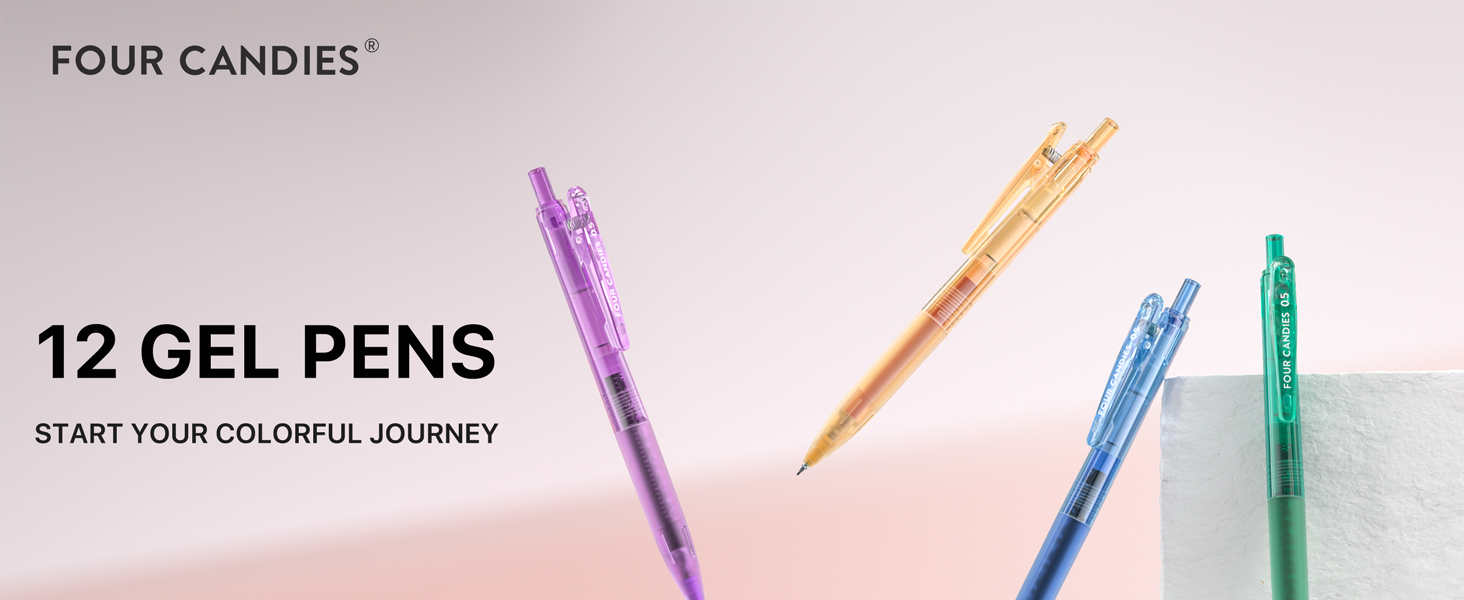 The Four Candies 12-Pack Gel Pen Set features 12 multicolor, 0.5mm fine tip retractable gel pens with quick-dry ink technology and a comfortable rubber grip. Transparent barrels reveal ink levels for hassle-free use, while refillable cartridges and protective nib seals extend pen life. Perfect for professionals, students, and creatives seeking vibrant, smudge-free writing on the go.