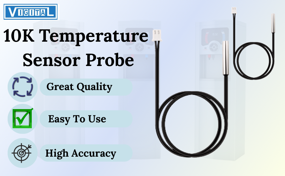 The VIGITAL Waterproof NTC Thermistor Temperature Sensor Probe delivers ultra-precise temperature readings with a 10K ±1% thermistor, housed in a rugged 304 stainless steel body. Rated IPX7 waterproof and capable of withstanding immersion up to 400mm, it operates reliably across a broad -20 to 105°C range. Designed for easy plug-and-play installation, it’s compatible with a wide array of appliances including water dispensers, HVAC systems, and DIY projects, making it the go-to sensor for professionals and enthusiasts seeking durability, accuracy, and efficiency.
