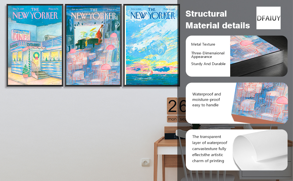 The DFAIUY Set of 3 New Yorker Magazine Posters features modern minimalist designs printed on premium canvas. Available in three sizes, these unframed artworks are perfect for adding a splash of color to any room. With high-definition prints and a satisfaction guarantee, they make an ideal gift for any occasion.