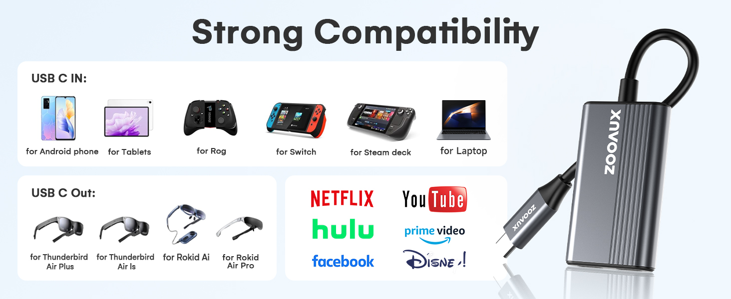 The ZOOAUX Xreal USB-C Hub is a versatile adapter designed for professionals and gamers alike, delivering 100W fast charging and 4K@60Hz Ultra HD video output. Compatible with a wide range of smart glasses, gaming consoles, laptops, and portable monitors, it offers plug-and-play convenience with built-in safety protections. Its compact, portable design ensures you stay connected and powered wherever you go.