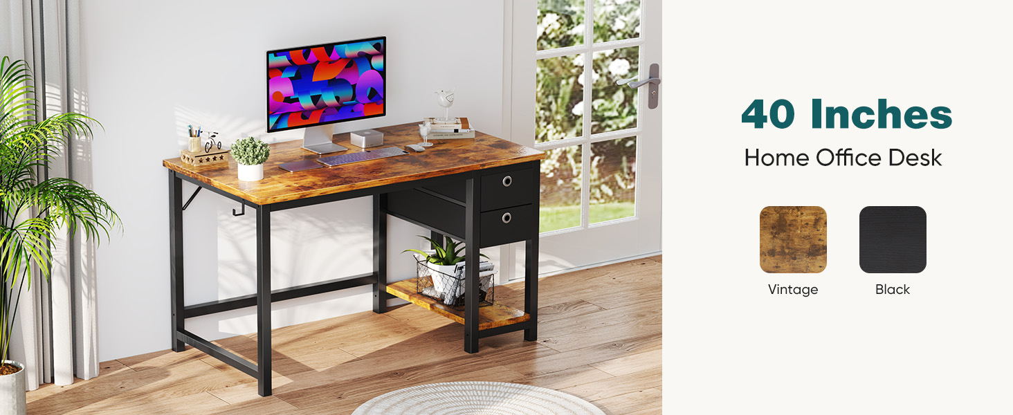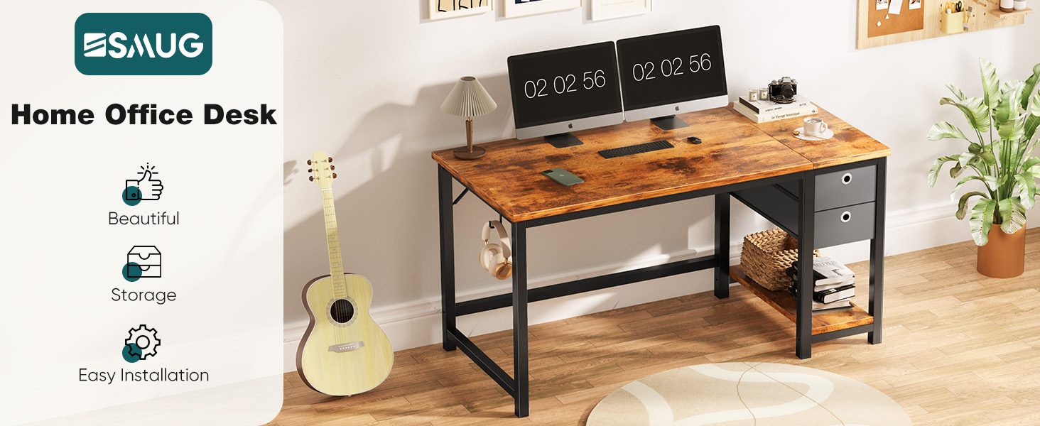 The SMUG Computer Desk combines a spacious 47x24 inch waterproof desktop with two fabric storage drawers and a sturdy rust-brown metal frame. Designed for modern living, it offers easy assembly, EPA-compliant materials, and versatile use in home or office settings—perfect for millennials seeking style and function in a compact footprint.