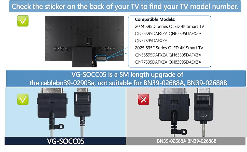 The Tjyuze One Connect Cable VG-SOCC05 is a 5-meter premium replacement cable designed exclusively for select Samsung OLED 4K TVs, including the S95D series. Featuring a unique dual-plug design for perfect fit and reliable performance, it ensures hassle-free connectivity and extended reach for flexible TV placement. Compatibility is strictly limited to specified models, guaranteeing optimal function and peace of mind.