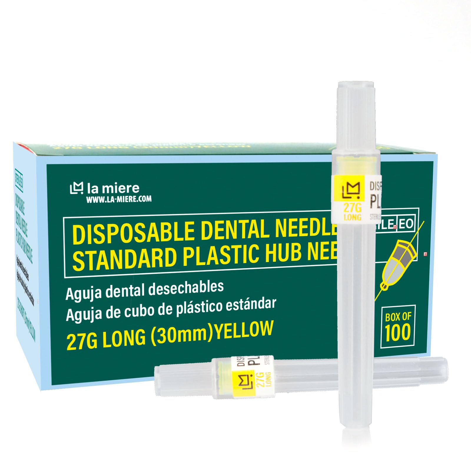LA MIERE 100P Disposable Premium Dental Plastic Hub Needles feature a 27G ultra-fine gauge and 30mm length, designed with a rounded, softer hub and double silicone coating to reduce patient discomfort. Color-coded hubs and bevel indicators streamline use, all packaged in a perforated box for hygienic, professional convenience.