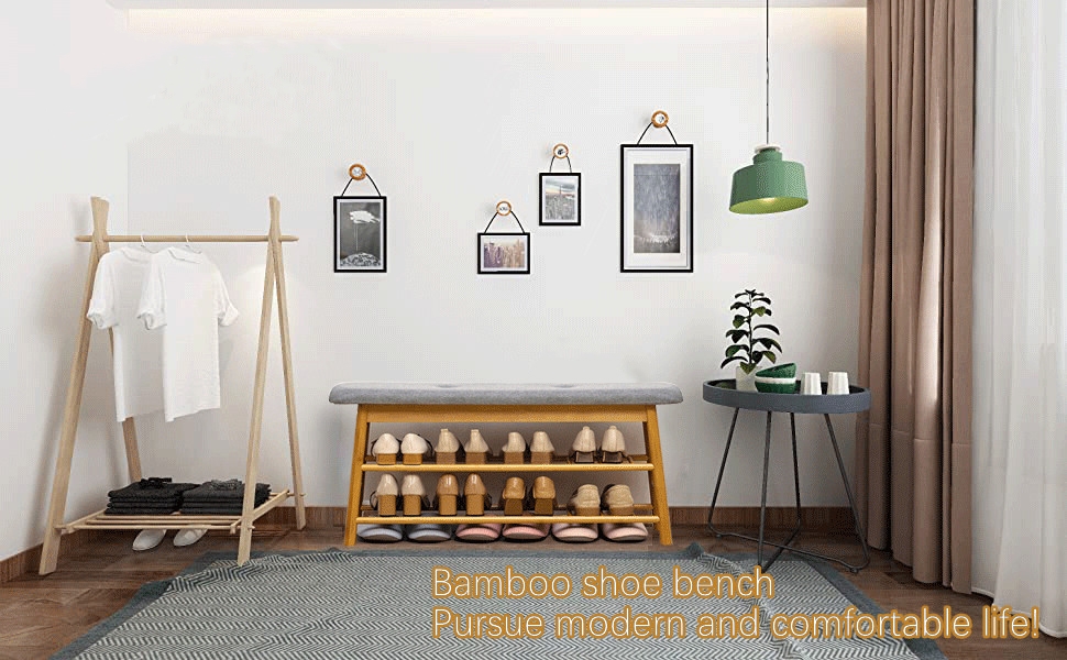 The MGPGNOV Bamboo Shoes Bench Seat is a large, eco-friendly storage bench measuring 90 x 44 x 27 cm, made from 100% natural bamboo. It features two open shelves that hold up to 8 pairs of shoes, a padded 2-inch thick seat with hidden storage, and a sturdy frame supporting up to 120kg. Perfect for entryways, living rooms, or corridors, it combines sustainable materials with multifunctional design to keep your space organized and stylish.