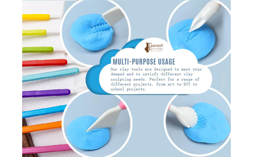 The Ganesh Pottery Plastic Ceramic Pottery Tools Set includes 8 double-ended carving tools, perfect for clay modeling, sculpting, and cake decorating. Designed for artists of all ages, this multi-color set is portable and ideal for various craft projects.