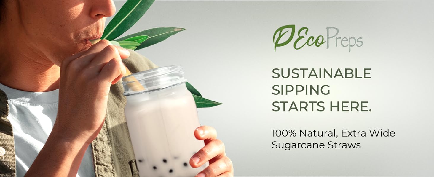 EcoPreps Biodegradable Jumbo Smoothie Straws are 8.3-inch long, extra-wide (0.5" diameter) drinking straws made from 100% natural sugarcane fibers. Certified compostable within approximately 12 months, these durable, non-soggy straws are BPA and PLA free, toxin-free, and TUV tested against microplastics. Designed with a pointed tip for easy use in sealed cups, they are ideal for thick beverages like smoothies, bubble teas, and milkshakes. Packaged sustainably in recyclable paper boxes, they come from an ethical, minority family-owned US company sourcing FSC-certified materials.