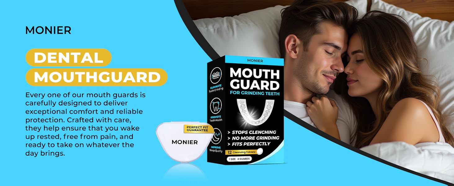 The MONIER Dental Night Guard set includes 4 moldable, food-grade EVA mouthguards and 12 cleansing tablets, designed to prevent teeth grinding and clenching. Customizable for a perfect fit, these guards reduce jaw stress, protect enamel, and promote better sleep hygiene with easy cleaning solutions.